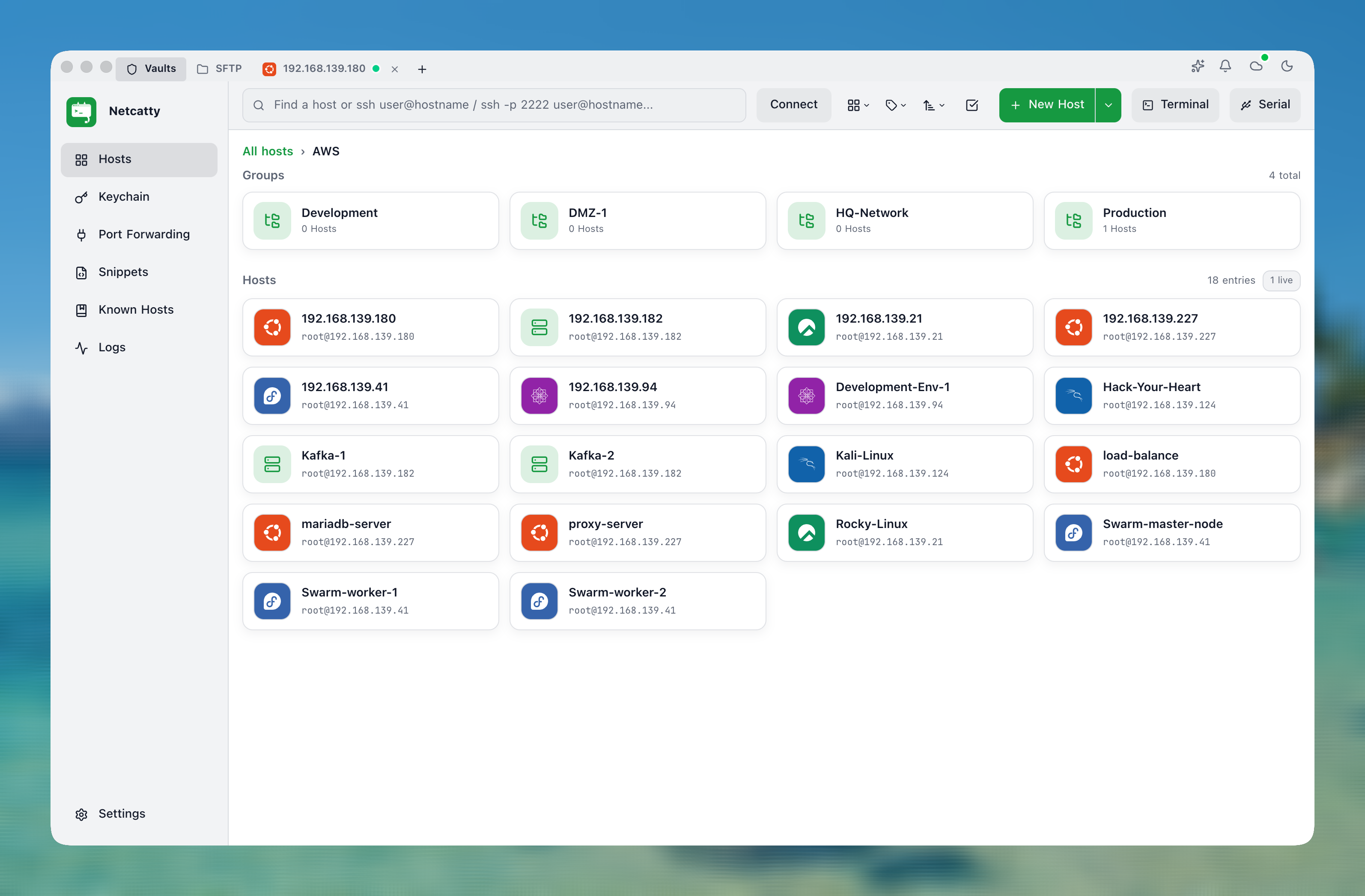 用你喜欢的方式浏览主机——卡片网格、紧凑列表或按文件夹分组的树视图。